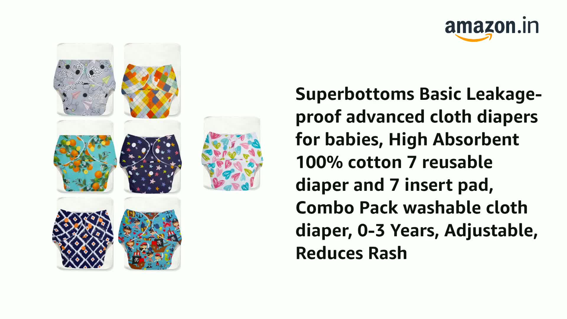 SuperBottoms BASIC Cloth Diaper | Side Leakage Proof Reusable Cloth Diaper with Quick Dry UltraThin pads|Freesize, Rash Free,for Kids 0-3 Yrs|Stay Dry & Lasts up to 3Hrs - (Assorted) (Basic Pack of 7)
