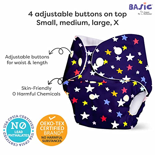 WATERPROOF ADJUSTABLE FREESIZE REUSABLE - Basic cloth diapers fit babies from 5kgs to 17kgs. You can easily adjust the size of the diaper to Small/Medium or Large/Extra Large depending on your baby's weight by snapping the buttons in the front. This helps