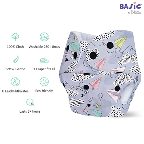 SuperBottoms BASIC Pack of 4 Freesize Adjustable, Washable and Reusable Cloth Diaper for babies 0-3 Years | One Size Adjustable Diapers (Pack of 4 diapers+ 4 inserts) Assorted prints