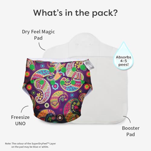CONTENTS: The pack contains 5 Freesize UNO Washable Cloth Diaper - New Version (5 Waterproof Outers + 5 Dry Feel Magic Pads (Cloth diaper inserts) with SuperDryFeel Layer). The adjustable cloth diaper is freesize and is ideal for babies from 7kg-17kg. Sup