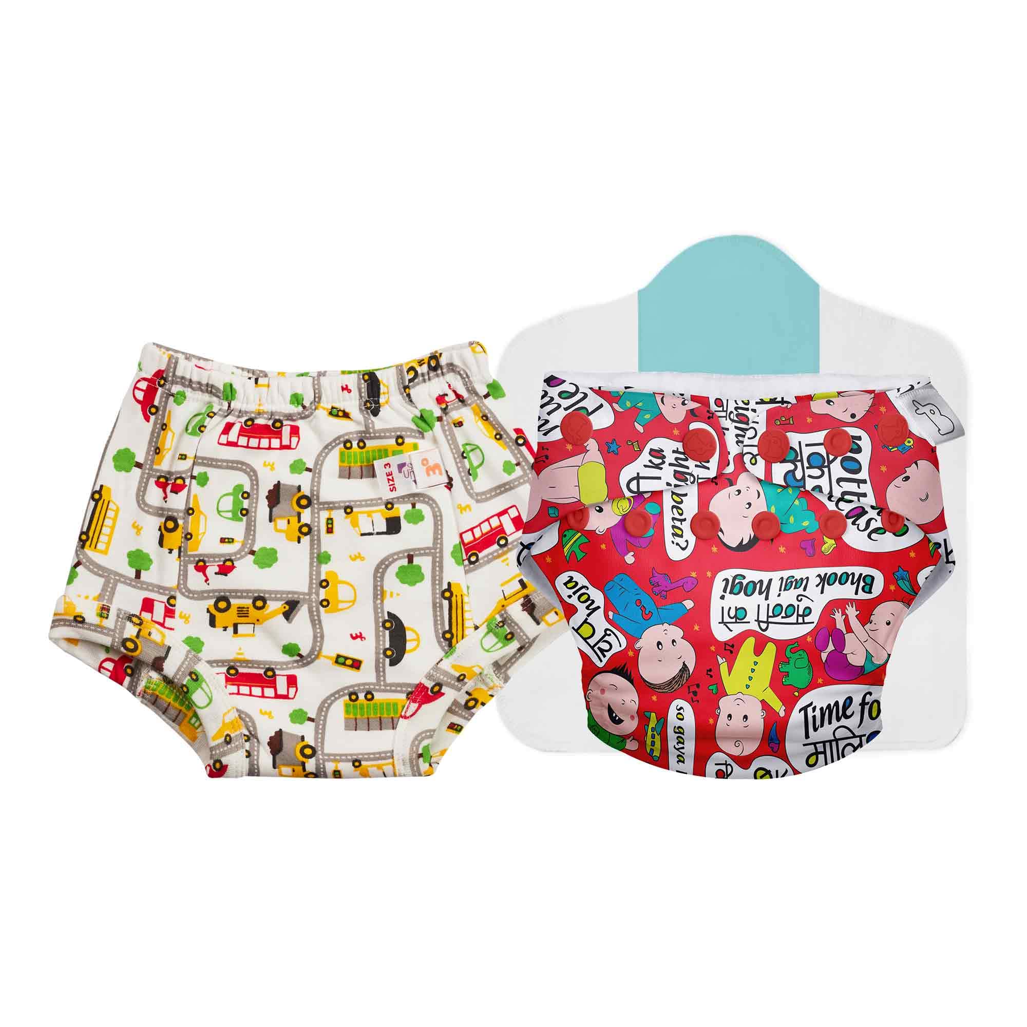 CONTENTS - A) Padded Underwear- Made of 3 layers 100% Cotton Padding MagicDry feel Layer for Stay Dry Semi waterproof for no more pee puddles Ideal for Potty Training B) Cloth Diaper - 1 Multisize waterproof outer 1 Magic Feel dry Pad . Our Magic Dry Feel