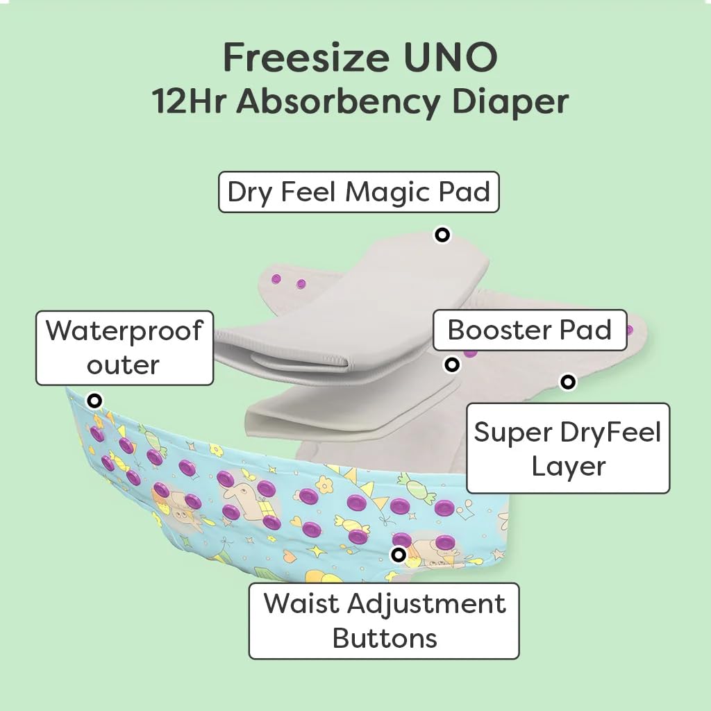 CONTENTS: This pack contains 5 items - 2 Freesize UNO Washable Cloth Diaper- (2 Waterproof Outer and 2 Dry Feel Magic Pad) and a Pack of 72 XtraHydrating WipesWipe Size : 20 x 15(WxL)cm . The adjustable cloth diaper is one size and is ideal for babies fro