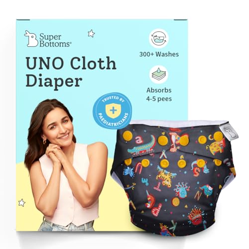 superbottoms UNO Freesize Premium Cloth Diaper for babies (3m-3y) + Organic Cotton Pad | Washable & Reusable 300+ Times | Superior Absorption | Waterproof | Super Soft & Gentle - Alphabets, 1 count