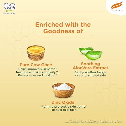 Himalaya Baby Rash Relief cream with Pure Cow Ghee and Soothing Aloe Vera Extract is specially formulated to keep new borns skin soft and protected from first use. The cream is enriched with 15% Zinc Oxide which soothes and helps heals irritated skin provides relief from irritation and protects your newborns nappies zones from rashes. The formula is designed with protective barier technology that performs a protective covering for long lasting protection from wetness.