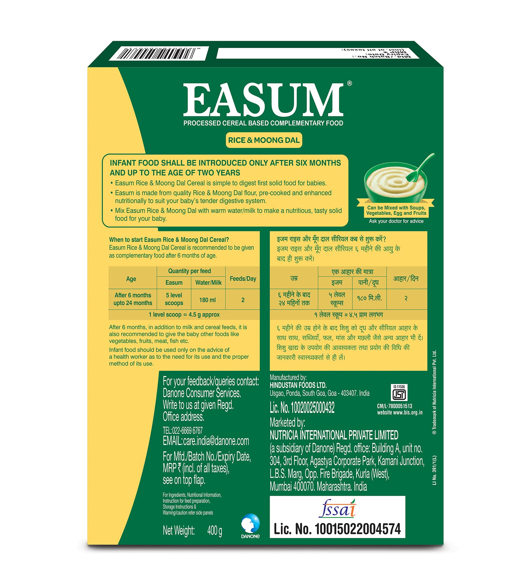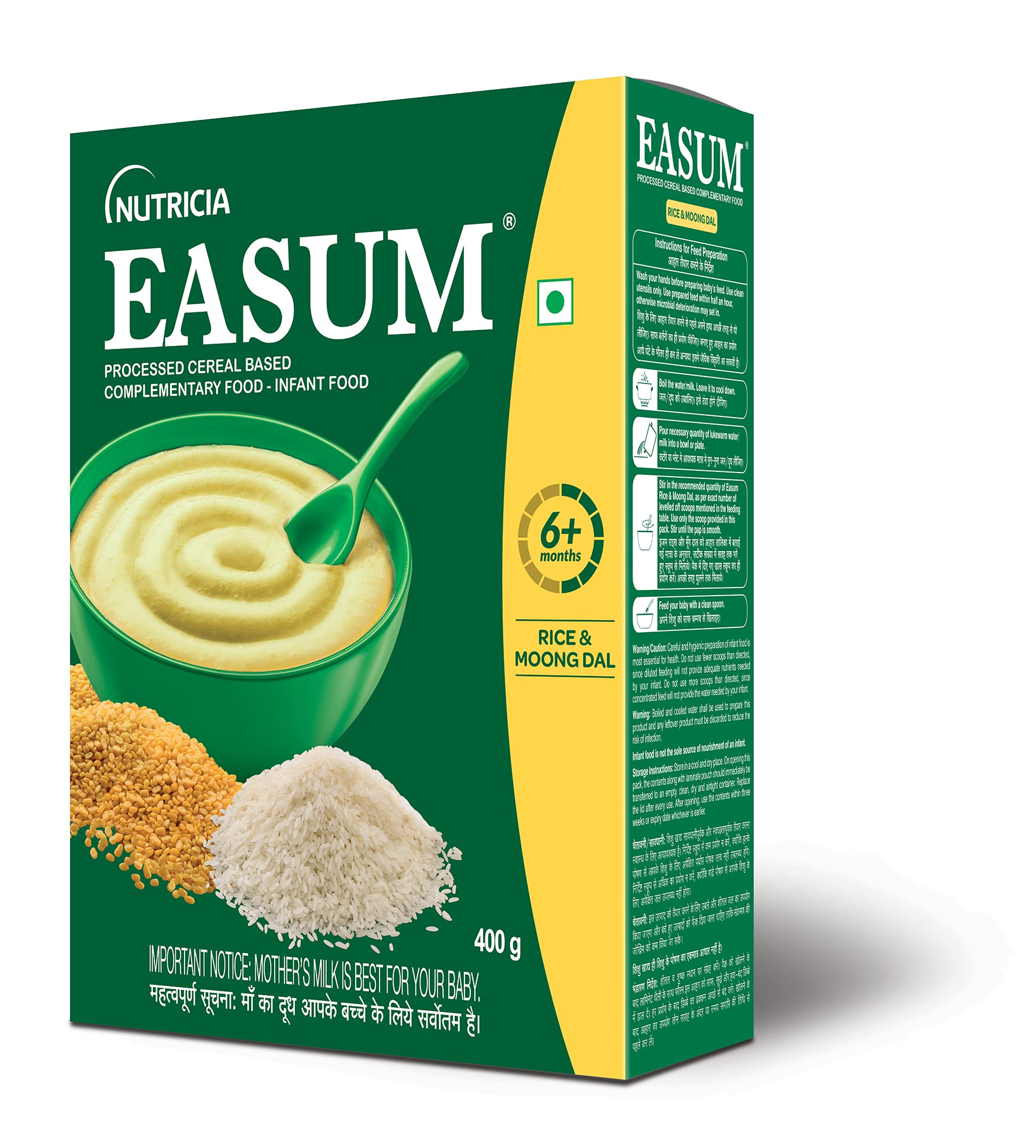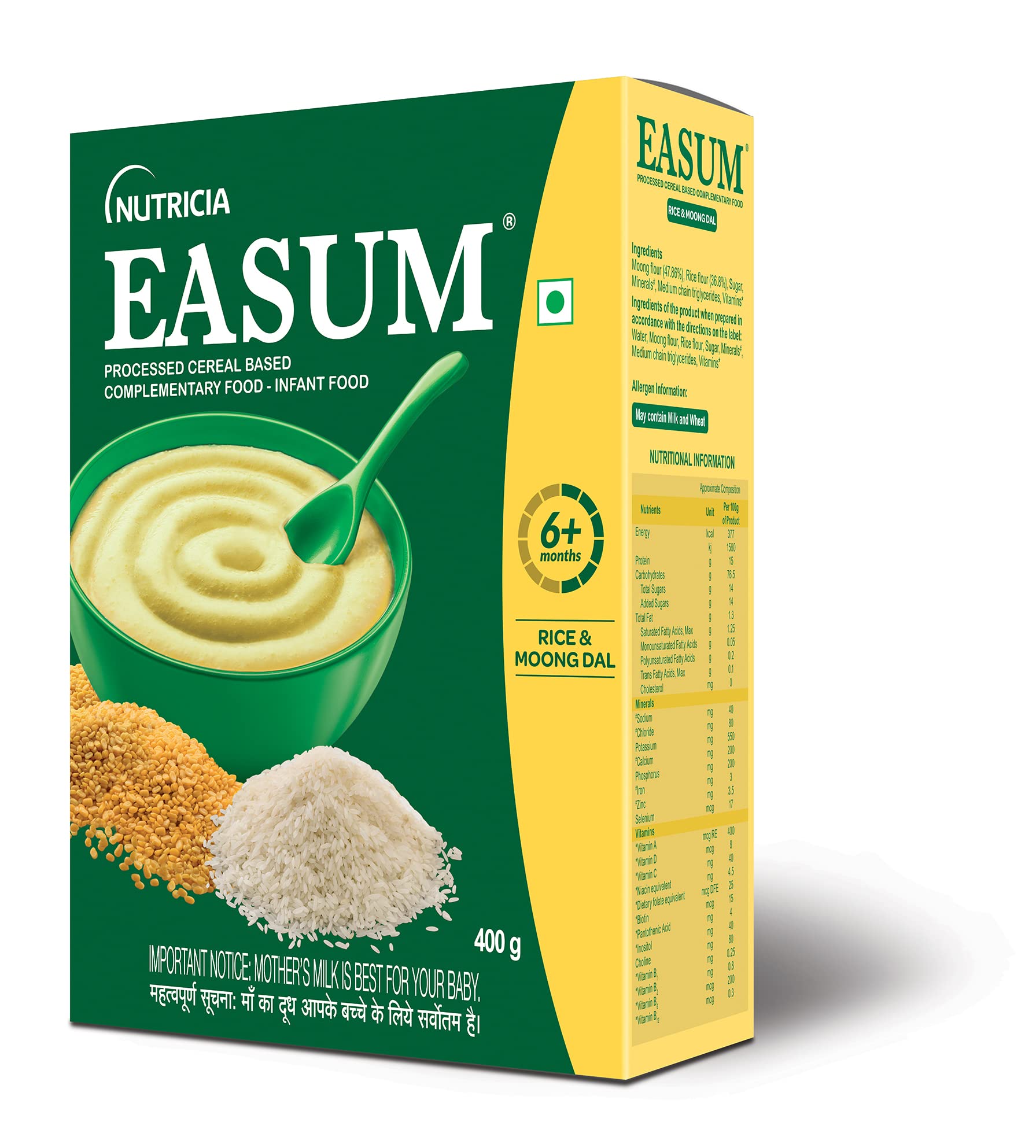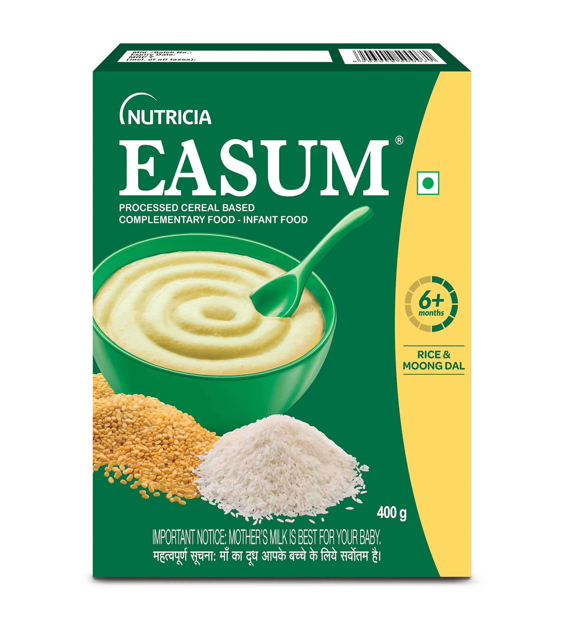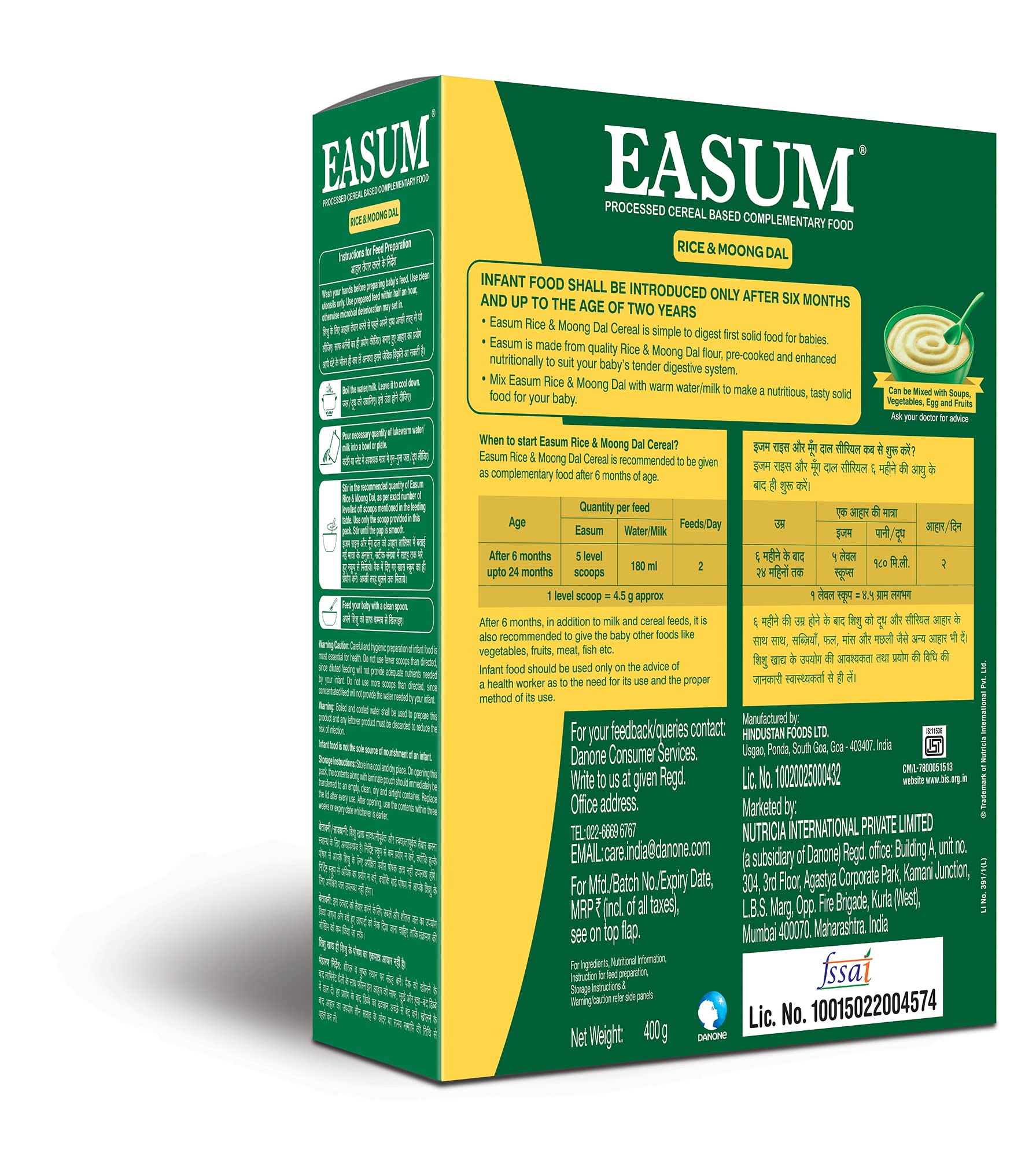 Easum Rice & Moong Dal Cereal is simple to digest first solid food for babies.Easum is made from quality Rice & Moong Dal flour pre-cooked and enhanced nutritionally to suit babytender digestive system