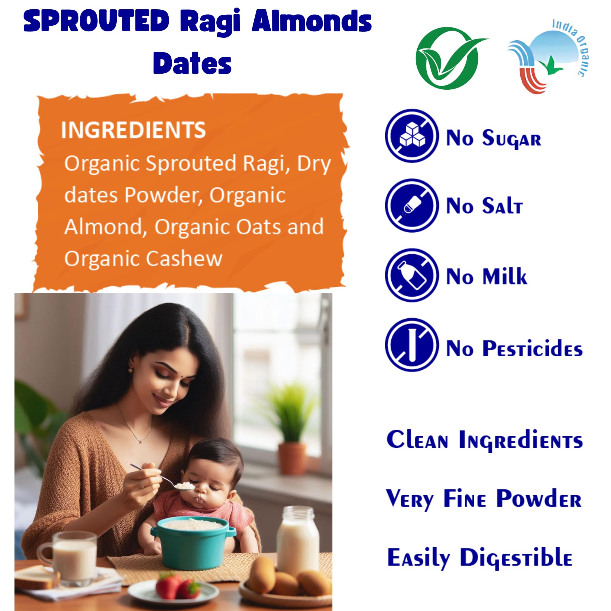 TummyFriendly Foods Organic Sprouted Ragi Almond Dates Porridge Mix | Made of Sprouted Ragi Powder for baby | Available in Trial Baby Packs too | Shelf-life 9 month | 200g (Dates)