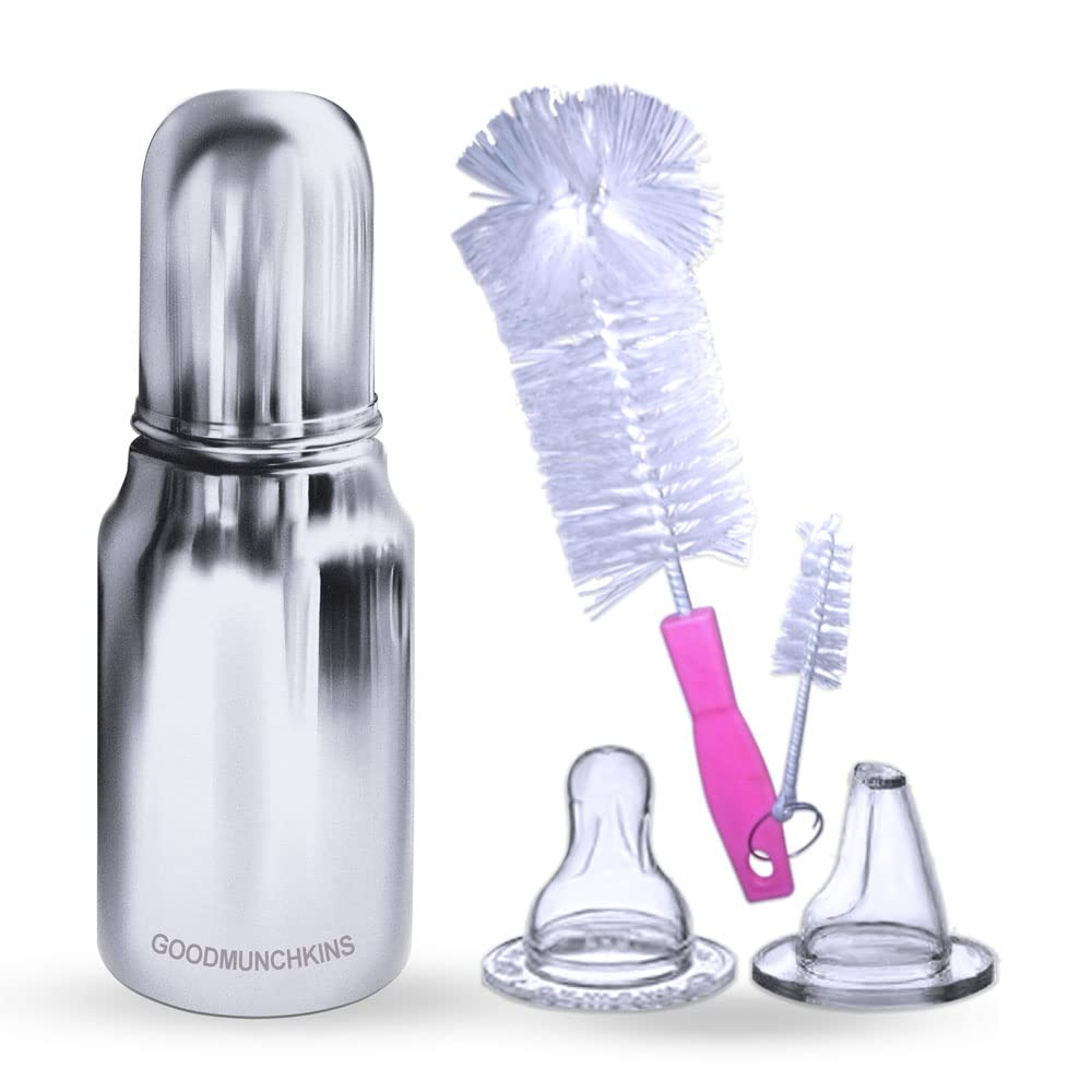 GOODMUNCHKINS Stainless Steel New-born Baby Feeding Bottle with Anti Colic Silicone Nipple with Nylon Bristle Bottle Cleaning Brush. We have two sizes in delux model i.e. 220ml 250ml Premium Mirror finishing in which we can store Milk/Water/Juice/Soup. Easy to hold for your Baby. Superior Lightweight Quality 304 Food Grade Stainless Steel Rust Free Product considering Health and Hygiene of your Baby The Nipple of the Bottle is made of Food Grade Silicon material. Spill-Proof Screw Type Nipple Cap and Push type outer lid makes the bottle completely leak-proof. Extra soft medical-grade silicone spout provides an easy transition from bottle-feeding. Free of - Biphenyl-A (BPA) phthalates nitrosamines lead PVC PET and biologically harmful chemicals. Free of BPA lead PVC nitrosamines phthalates PET and biologically harmful chemicals. Easy to Carry Easy to Handle and Easy to Clean. No smell. No mess. Smooth Design with no sharp curves or edges keeping in mind Easy and Safe cleaning of the bottle. The bottle is of sleek design and is very convenient while handling. Reduces sterilization work. Only Silicon Nipple needs to be sterilized. The bottle can be washed with soap and water ready to use again. A GOODMUNCHKINS Made in India Product