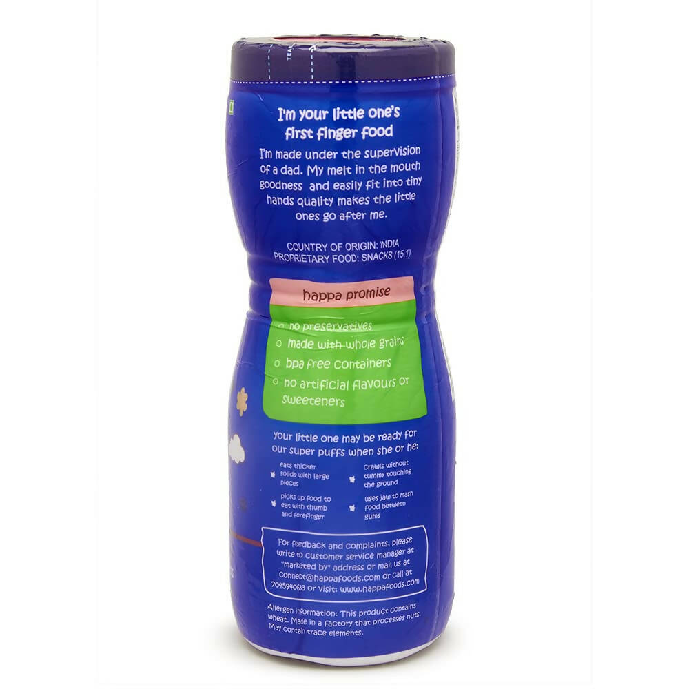 Happa Organic Multigrain Vanilla + Blueberry Melts Super PuffsAbout the product:Happa Super Puffs are the perfect snack for your little one! These yummy treats come in a variety of delicious flavors like banana, strawberry, blueberry, etc. They are made with natural ingredients and crafted by a dad who wants the best for his baby. These puffs are not only delicious but also nutritious too. They are also easy for little hands to pick up and hold, promoting fine motor skill development and providing a perfect option for teething babies and their melt-in-the-mouth texture makes it easier for the baby to consume. And like all Happa products, these super puffs are free from artificial preservatives and colors. So, if you're looking for a tasty, nutritious, and easy-to-handle snack for your baby, Happa Super Puffs are the way to go! Snack on them too! We have a wide variety of flavors to give your baby choices.Legal Disclaimer: Product images are for illustrative purposes only. Images/packaging/ labels may var