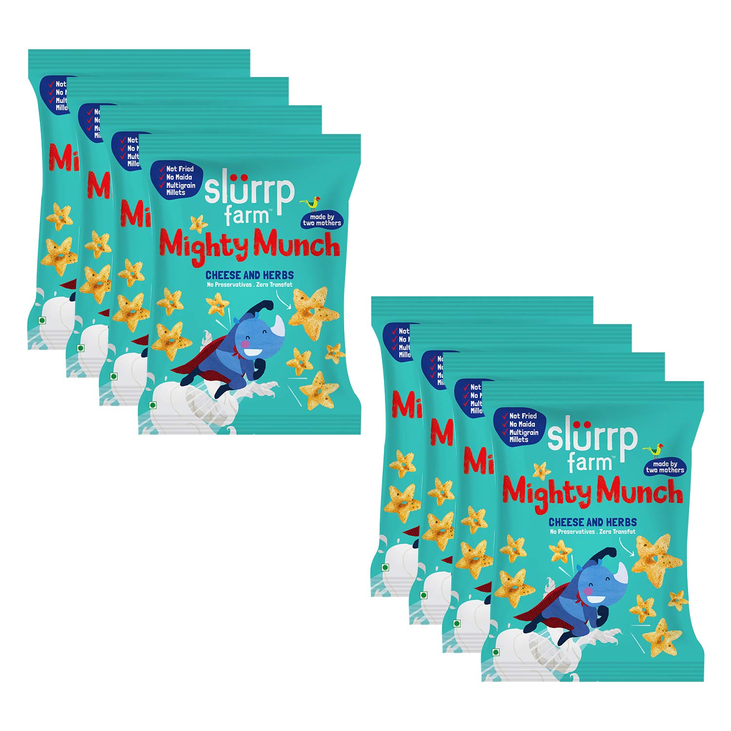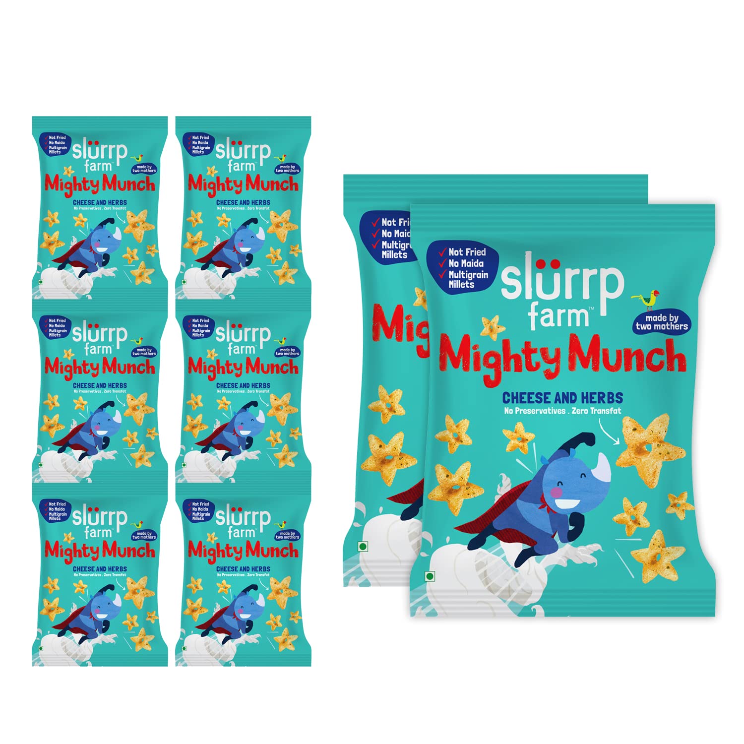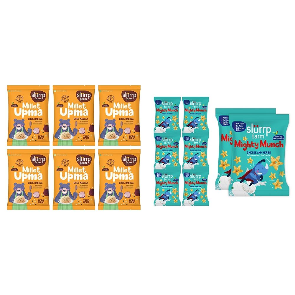 Slurrp Farm Instant Millet Rava Upma Mix- Ghee Masala - Multigrain Breakfast Mix | No Palm Oil | 50g X 6An instant breakfast meal made with a blend of millets (jowar oats bajra) chana suji and urad dal. Comes in yummy ghee & tomato masala flavours with no preservatives no artificial colours or flavours no trans fat no palm oil. Ready in 2 minutes. Slurrp Farm Millet Upma Mix is a convenient and nutritious option during morning rush or travel with family. Now everyone will be #UpForUpma \U0001f60b\U0001f60Slurrp Farm Healthy Snacks for Kids | Mighty Puff Cheese & Herbs| Not Fried No Maida | Snack for School Tiffin and Travel-Friendly | 8X 20g EachCrunchy-munchy and loaded with nutritional benefits the Slurrp Farm mighty puff and mighty munch are perfect anytime snacking options for all ages. Ragi and jowar coupled with a lovely cheesy and a hint of parsley - what not to like. Adults and children both love this one. Guilt free happiness - they are designed for school going kids to pop into their bags and their parents too. About the brand: at Slurrp Farm we are passionate about raising awareness of healthy eating for children and giving busy parents like us the convenience needed in terms of being able to find food options which are as good as what we would make at home. Our recipes always start at home from amongst our friends and families. After many home trials we perfect them in consultation with nutritionists and paediatricians.