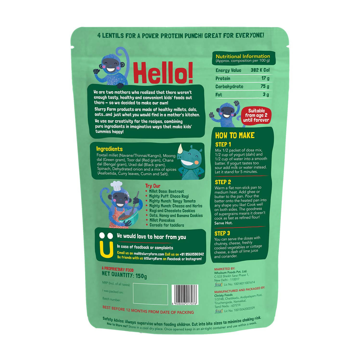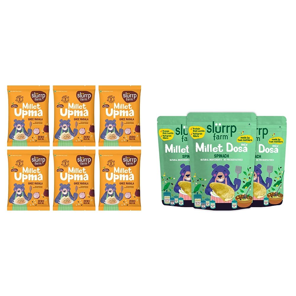 Slurrp Farm Instant Millet Rava Upma Mix- Ghee Masala - Multigrain Breakfast Mix | No Palm Oil | 50g X 6An instant breakfast meal made with a blend of millets (jowar oats bajra) chana suji and urad dal. Comes in yummy ghee & tomato masala flavours with no preservatives no artificial colours or flavours no trans fat no palm oil. Ready in 2 minutes. Slurrp Farm Millet Upma Mix is a convenient and nutritious option during morning rush or travel with family. Now everyone will be #UpForUpma \U0001f60b\U0001f60Slurrp Farm High Protein Millet Dosa Instant Mix Supergrains And Spinach Natural And Healthy Food 150g (Pack Of 3)Slurrp farms millet dosa mix is a convenient easy to make and a healthy dosa mix to have. It is filled with the goodness of supergrains and spinach to bring out the best flavour in the dosas. Consisting of a lot of nutrients and no harmful ingredients it is a great option to have anytime for you and for your fussy little ones as well. These are also a great option for when you are travelling with a toddler. It's different color from your regular dosa makes it an attractive meal to have for anyone anytime. About the brand : at slurrp farm we are passionate about raising awareness of healthy eating for children and giving busy parents like us the convenience needed in terms of being able to find food options which are as good as what we would make at home. Our recipes always start at home from amongst our friends and families. After many home trials we perfect them in consultation with nutritionists and pediatricians.