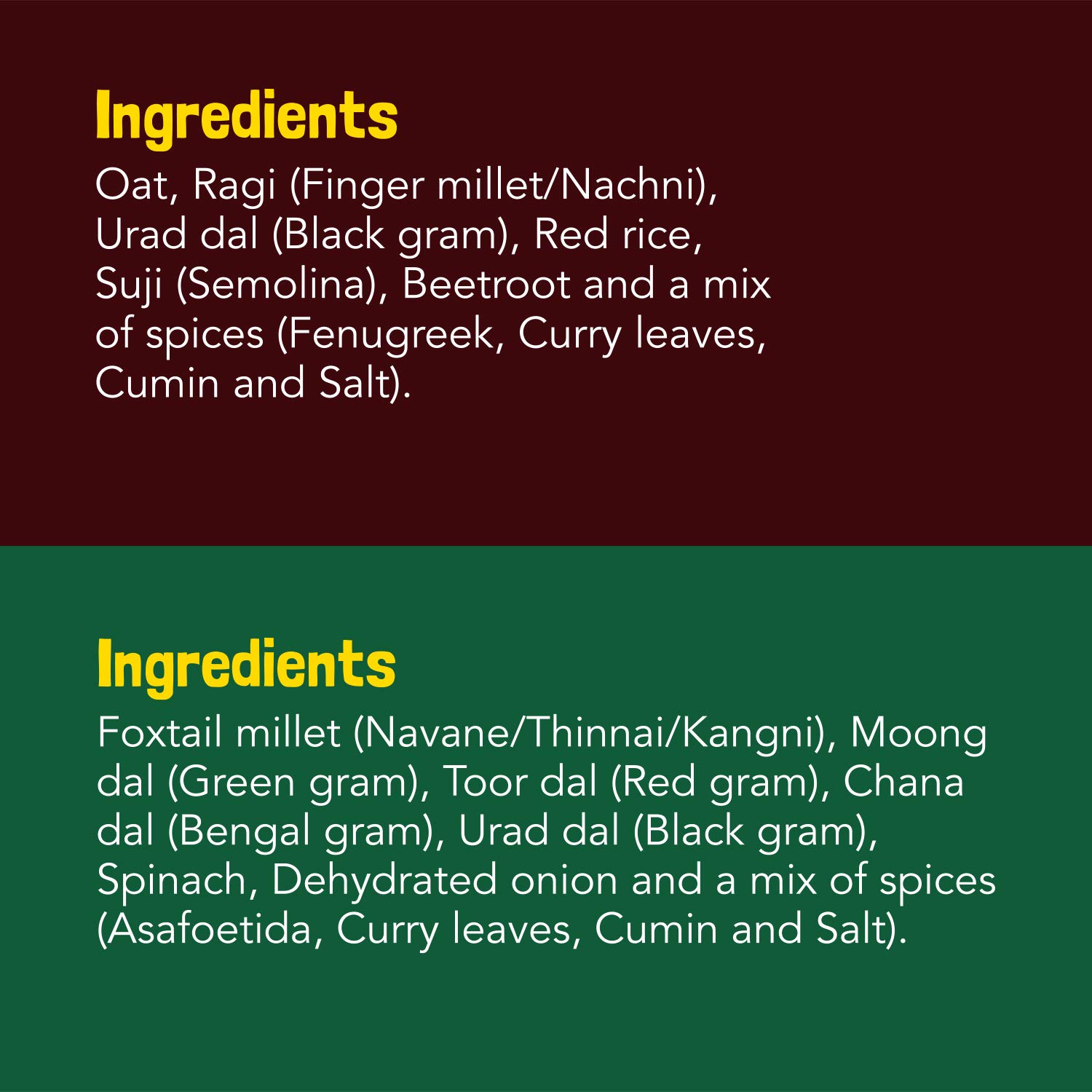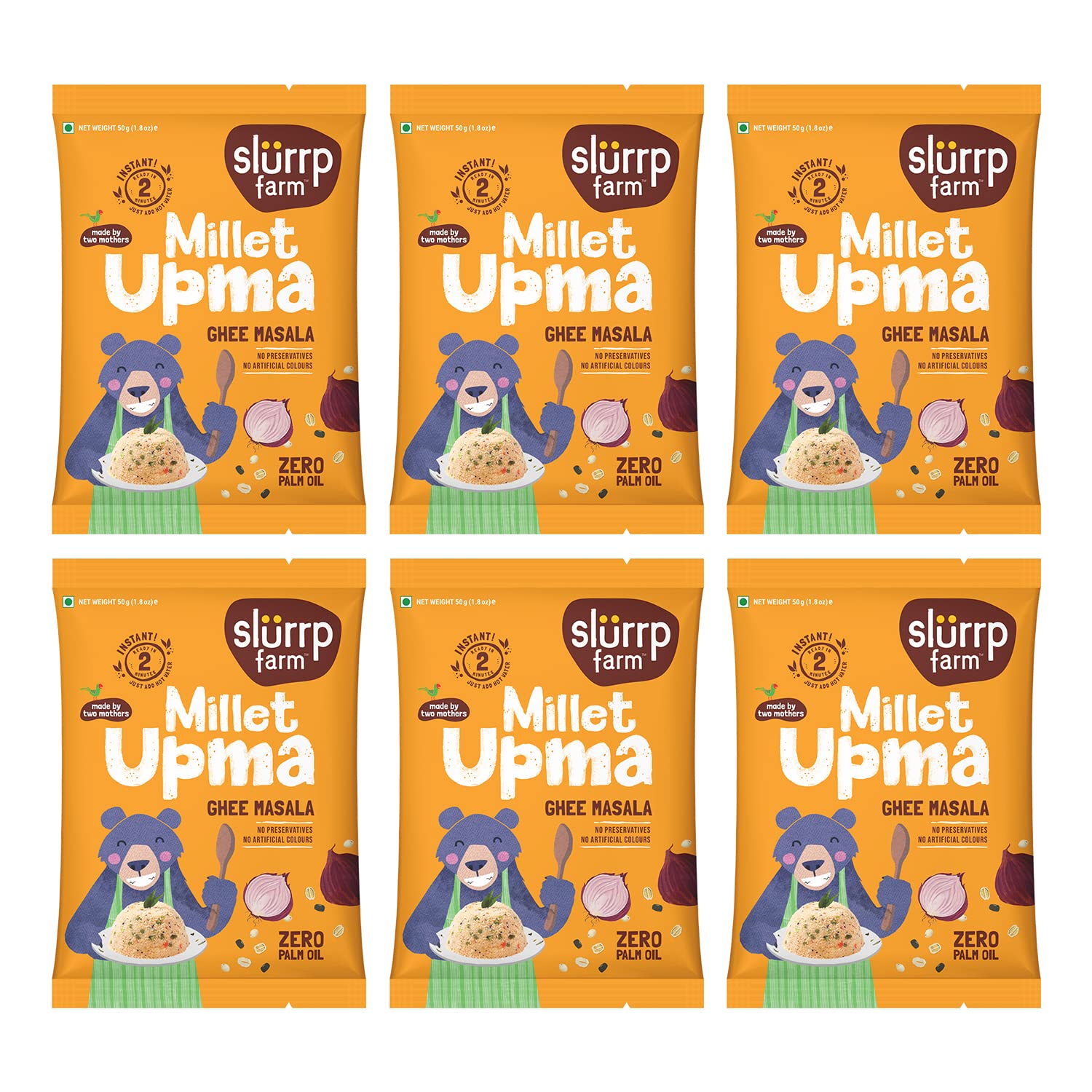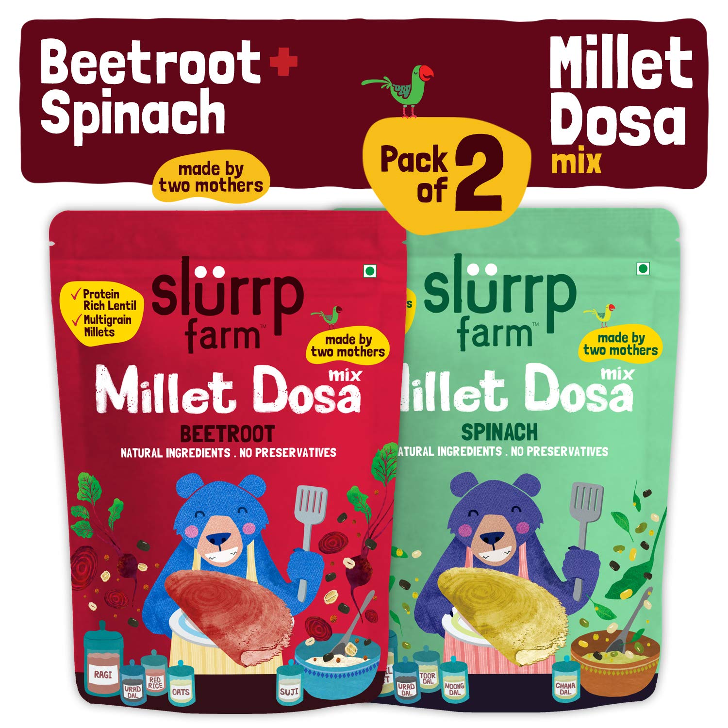 Slurrp Farm Instant Millet Rava Upma Mix- Ghee Masala - Multigrain Breakfast Mix | No Palm Oil | 50g X 6An instant breakfast meal made with a blend of millets (jowar oats bajra) chana suji and urad dal. Comes in yummy ghee & tomato masala flavours with no preservatives no artificial colours or flavours no trans fat no palm oil. Ready in 2 minutes. Slurrp Farm Millet Upma Mix is a convenient and nutritious option during morning rush or travel with family. Now everyone will be #UpForUpma \U0001f60b\U0001f60Slurrp Farm Millet Dosa Instant Mix Supergrains Spinach And Beetroot Natural And Healthy Food 150g (Pack Of 2)At slurp farm we make honest and healthy food just like you would at home. So this dosa mix has no preservatives no artificial flavours and no colours. It is filled with the goodness of five super grains are ragi red rice oat urad dal suji beetroot and mild spices. Based on traditional dosa recipes from our family kitchen made by two mothers for you and your children.