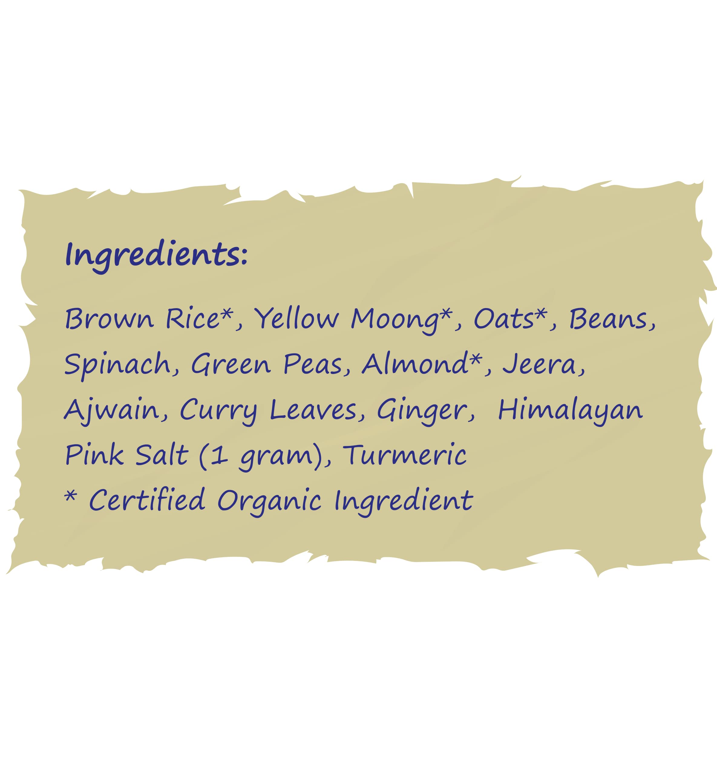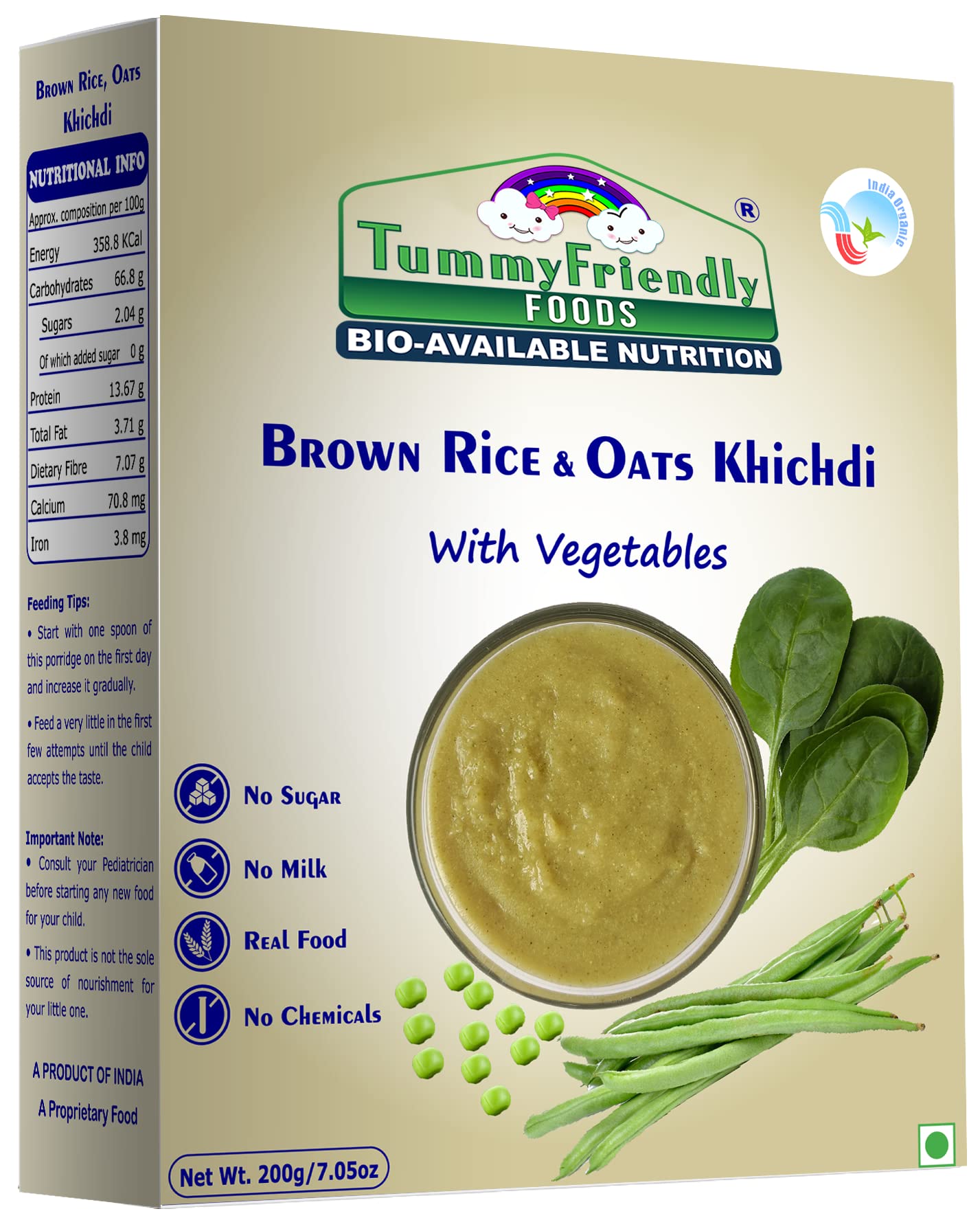 TummyFriendly Foods Organic Millet Khichdi Mix With Vegetables for Toddler | Millet Khichdi Mix For Baby 1 Year plus | Available in Trial Baby Packs too | Shelf-life 9 month | 200g✅ Rava texture suitable for babies above 1 year ✅ NO CHEMICAL FORTIFICATION ✅ No Sugar No Milk & No GMOTummyFriendly Foods Organic Brown Rice and Oats Khichdi Mix With Vegetables For Toddlers | Available in Trial Baby Packs too | Organic Baby Food for 1 year old baby | Shelf-life 9 month | 200g♥ Organic Brown Rice and Oats Khichdi Mix With Vegetables For Toddlers 200g ♥ Brown Rice is known to have high levels of Manganese an essential mineral for bone health and nutrient metabolism ♥ Oats are famous for Beta-Glucan a soluble fiber that promotes heart health and healthy gut bacteria♥ Spinach is rich in Vitamin K and is a good source of beta carotene chlorophyll zeaxanthin and lutein which are responsible for boosting the immune system ♥Almonds are a great source of Healthy-Fat ♥ Rich in Dietary-Fibre which keeps the little tummy happy and healthy. ♥ Excellent for rapid growth years year on year ♥ Organic Food For Little Ones 9+ month Shelf-Life ♥ No Sugar No Salt No Chemicals No Pesticides No GMO No extracts and No Unhealthy Ingredients. ♥ Only Real Food!