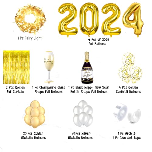 4 Pcs of 2024 Digit Balloons 1 Pc Black Happy New Year Bottle Balloon 4 Pcs Golden Confetti Balloons 1 Pc Nano Glue Dot Tape 1 Pc 3 Meter LED Light 2 Pcs Golden Backdrop Curtain New Year decorations items 2024 1 Pc Champagne Glass Shape Balloons 40 Pcs Golden and Silver Metallic Balloons 1 Pcs Arch Strip Tape. HOW TO DECORATE THIS HAPPY NEW YEAR COMBO This can be decorated in many areas like on wall garden in room windows outdoor plants or indoor plants and can be best for christmas tree decoration living room light tree for home decoration christmas decoration for balcony corner decoration items bedroom decoration fairy garden decoration items stars for christmas festival christmas decorations. EASY TO USE NEW YEAR COMBO LIGHTS FOR DECORATION This New Year decoration item for home decor light is very easy to use. Just hang this string lantern from anywhere and switch on the light of led. Your entire space in the house will look very lit. Include this fairy string light in christmas gift box or use it as new year home decoration items it will definitely make your festival worth celebrating. Safe and waterproof string light. This SilberOly 2024 Happy New Year decoration contains :- 4 Pcs of 2024 Digit Balloons 2 Pcs Golden Backdrop Curtain 1 Pc Champagne Glass Shape Balloons 1 Pc Black Happy New Year Bottle Balloon 4 Pcs Golden Confetti Balloons 1 Pcs Arch Tape 1 Pc Glue Dot Tape. 1 Pc 3 Meter LED Light. 20 Pcs Golden Metallic Balloons. 20 Pcs Silver Mertallic Balloons.