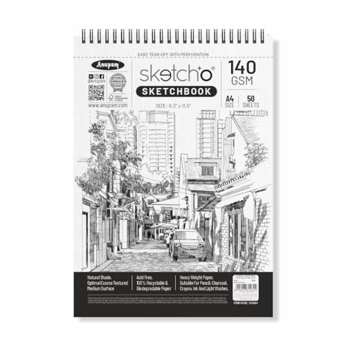 Anupam is an in-house manufacturing brand which supplies stationery products and art materials in India. It was incepted in the year 1973Anupam stationery prides in providing only the highest quality. Whether its a reflection of our happiness our grief our joy our wonder or our longing art is the legacy we will leave behind to tell future generations who we were at this place in time.Although Anupam started its journey with papers it now has an array of art products starting from papers and canvases to easels and takes pride in supplying quality products at an affordable rate.We want to ensure you have a great experience with our products because we truly care about our customers. we're proud of so purchase our products with the confidence. Ideal Use: Sketching drawing doodling graphite painting charcoal painting watercolors acrylic paint ink and pencil thanks to its premium surface. Best sketch book for sketching Sizes available - A5 A4 - Portrait Square (20cm x 20cm) A6 and A3 - Portrait High-quality drawing paper may be used with a variety of media including The ideal paper for sketching drawing manga cartoons still life stippling and experimenting with new techniques Strong smooth and easily absorbing colors and lines which reduces blotching smudges and accidents. Coloring book sketchbook and blank-page book appropriate for all ages Thickness: 140 GSM Cartridge Paper Type of Binding: Hardbound Paper Colour: Natural Shade Cartridge Paper Type of Paper: Optimal Coarse PH Neutral and Acid-Free Paper Number of Pages: 128 in all the sizes