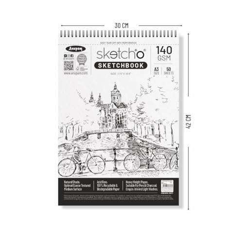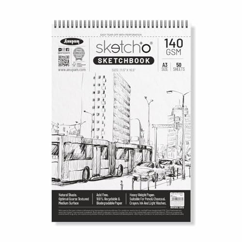 Anupam is an in-house manufacturing brand which supplies stationery products and art materials in India. It was incepted in the year 1973Anupam stationery prides in providing only the highest quality. Whether its a reflection of our happiness our grief our joy our wonder or our longing art is the legacy we will leave behind to tell future generations who we were at this place in time.Although Anupam started its journey with papers it now has an array of art products starting from papers and canvases to easels and takes pride in supplying quality products at an affordable rate.We want to ensure you have a great experience with our products because we truly care about our customers. we're proud of so purchase our products with the confidence. Ideal Use: Sketching drawing doodling graphite painting charcoal painting watercolors acrylic paint ink and pencil thanks to its premium surface. Best sketch book for sketching Sizes available - A5 A4 - Portrait Square (20cm x 20cm) A6 and A3 - Portrait High-quality drawing paper may be used with a variety of media including The ideal paper for sketching drawing manga cartoons still life stippling and experimenting with new techniques Strong smooth and easily absorbing colors and lines which reduces blotching smudges and accidents. Coloring book sketchbook and blank-page book appropriate for all ages Thickness: 140 GSM Cartridge Paper Type of Binding: Hardbound Paper Colour: Natural Shade Cartridge Paper Type of Paper: Optimal Coarse PH Neutral and Acid-Free Paper Number of Pages: 128 in all the sizes