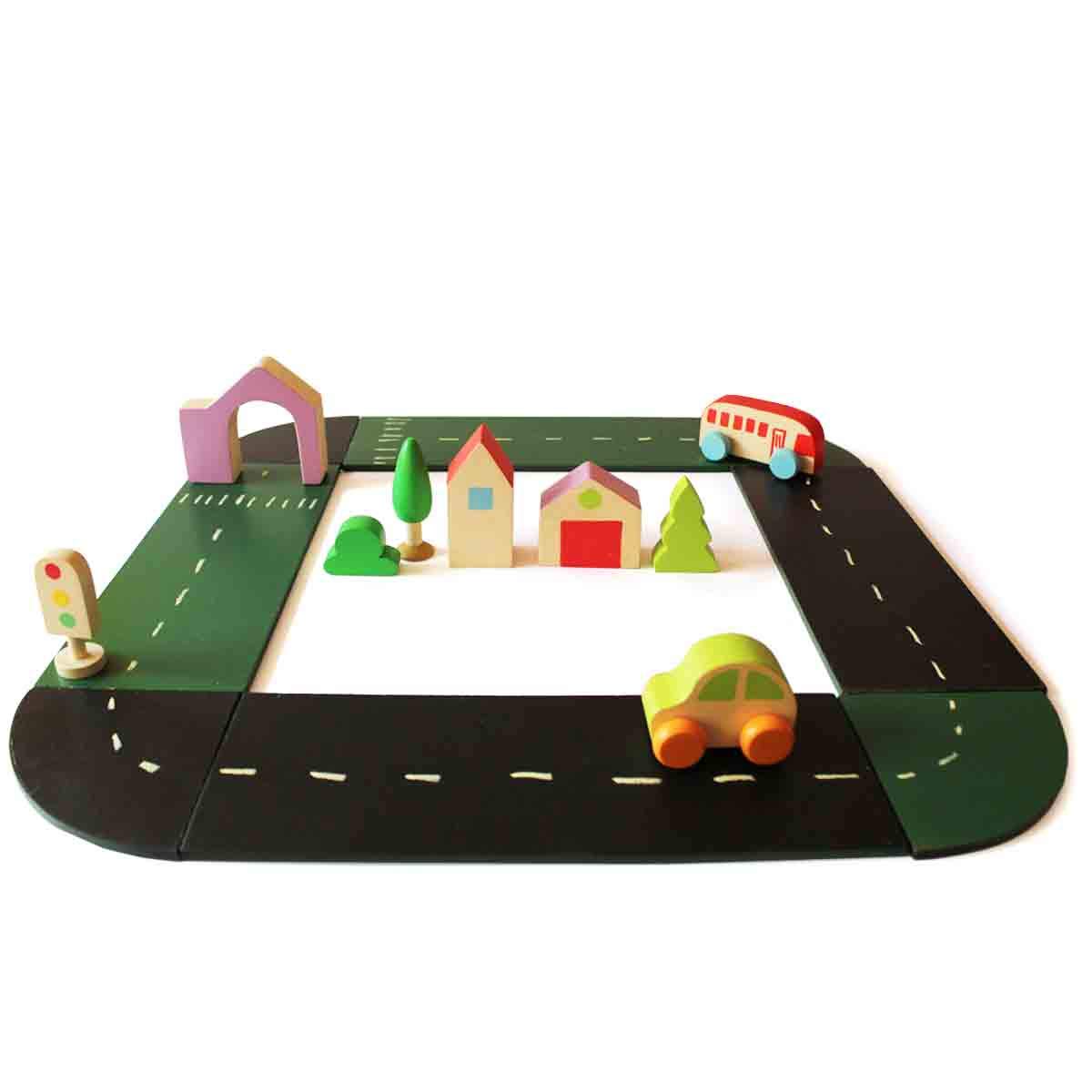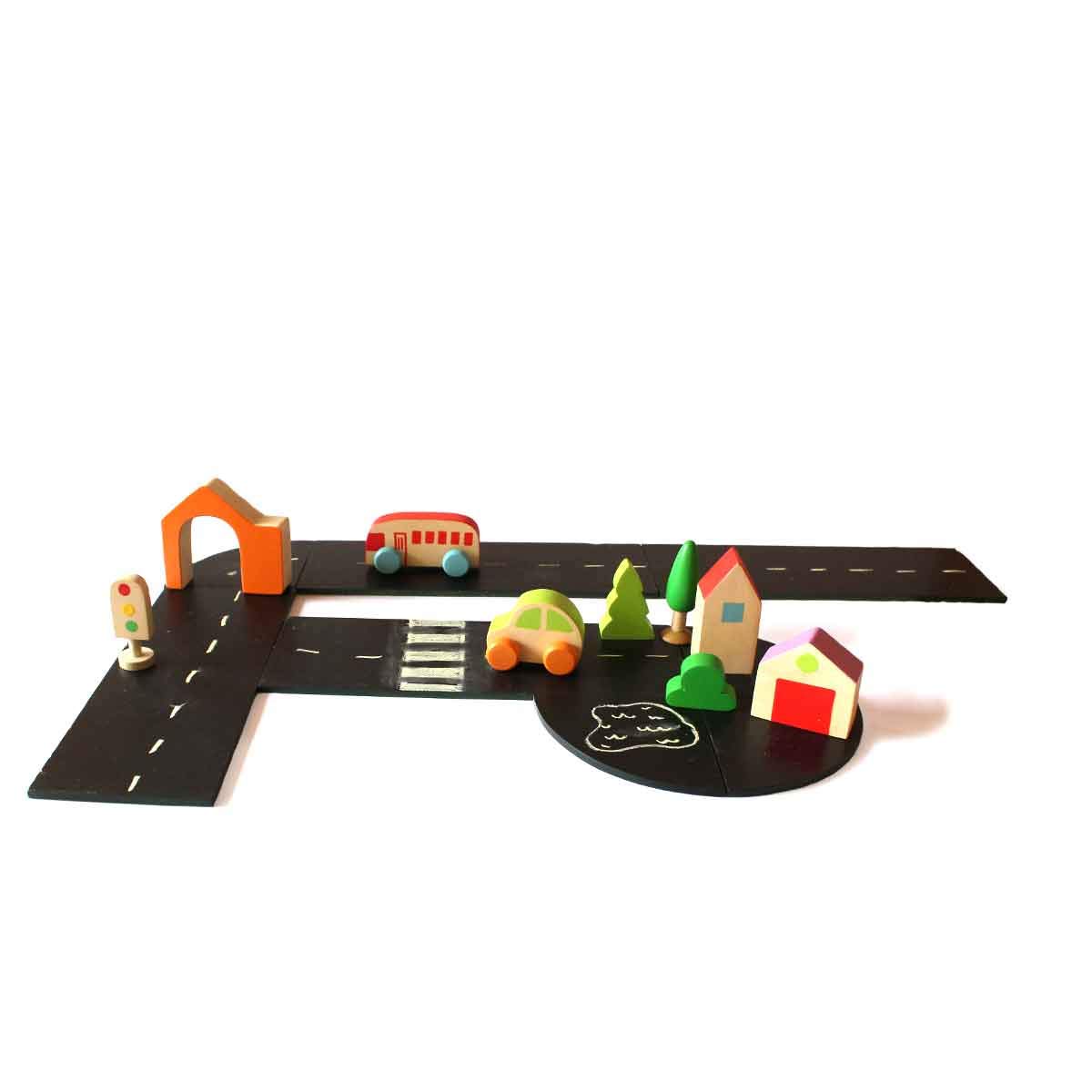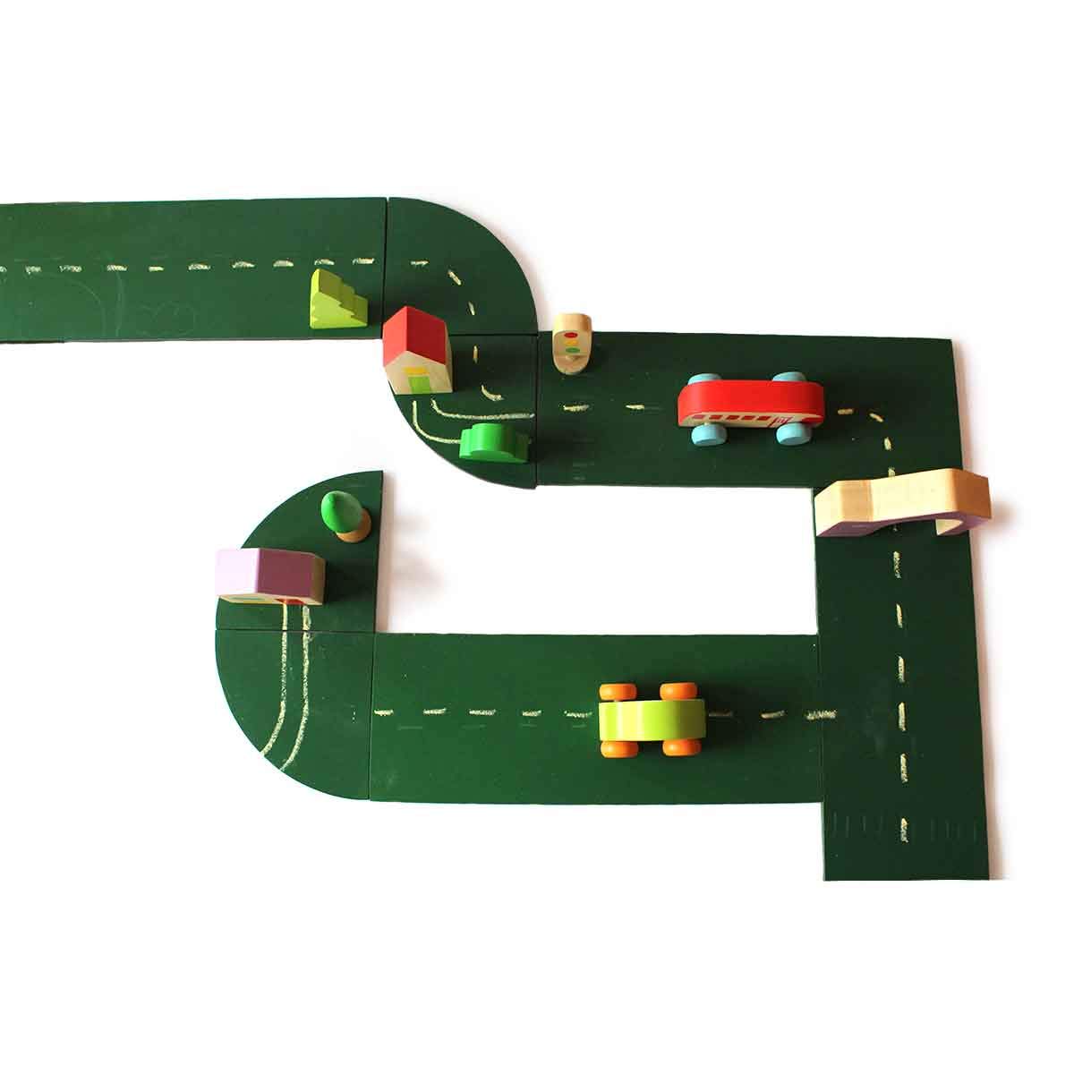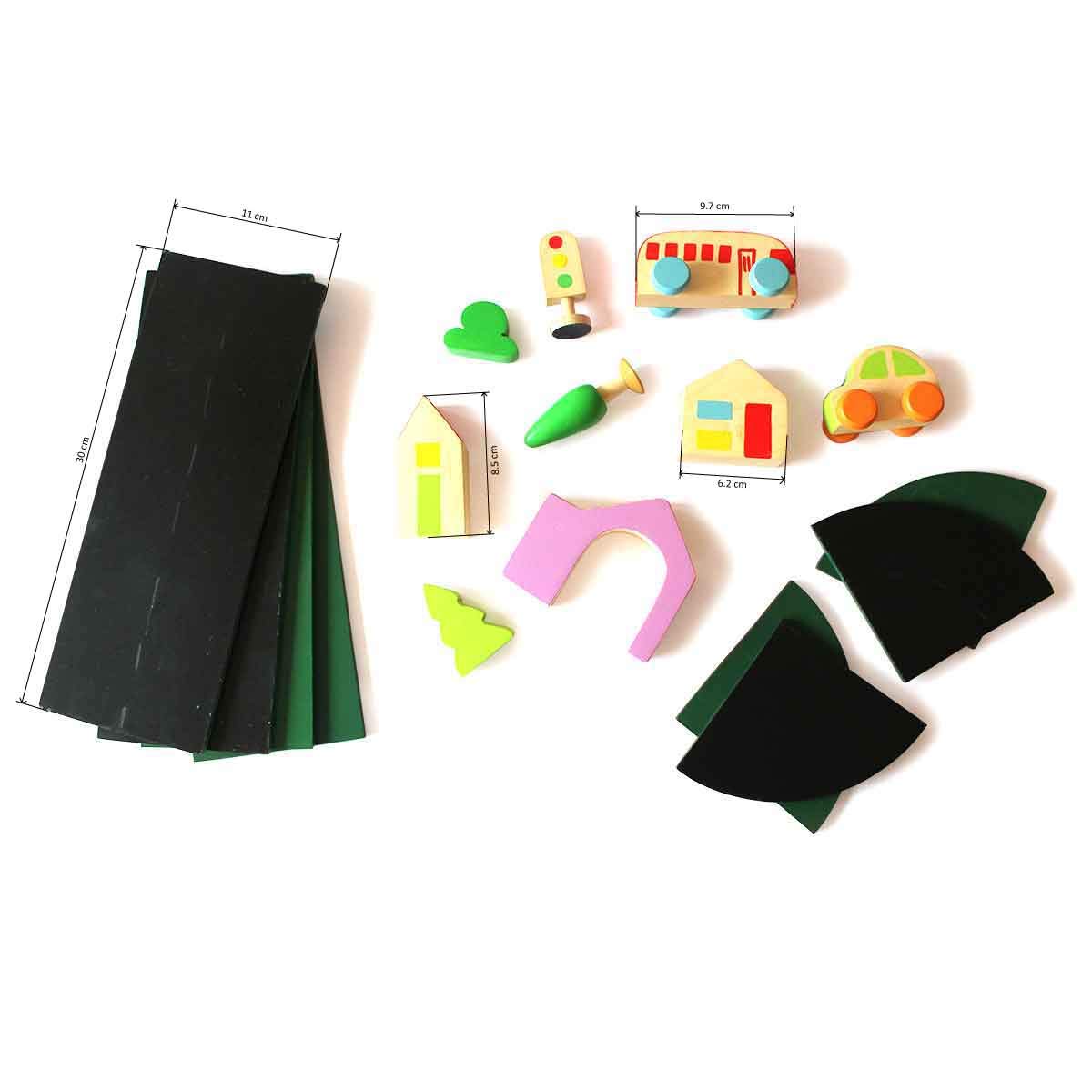 WHAT YOU GET: 9 standalone elements handcrafted for little hands to hold and place- trees bush traffic light houses bridge car and bus. Four rectangular and four quarter circle boards green on one side and black on the other.