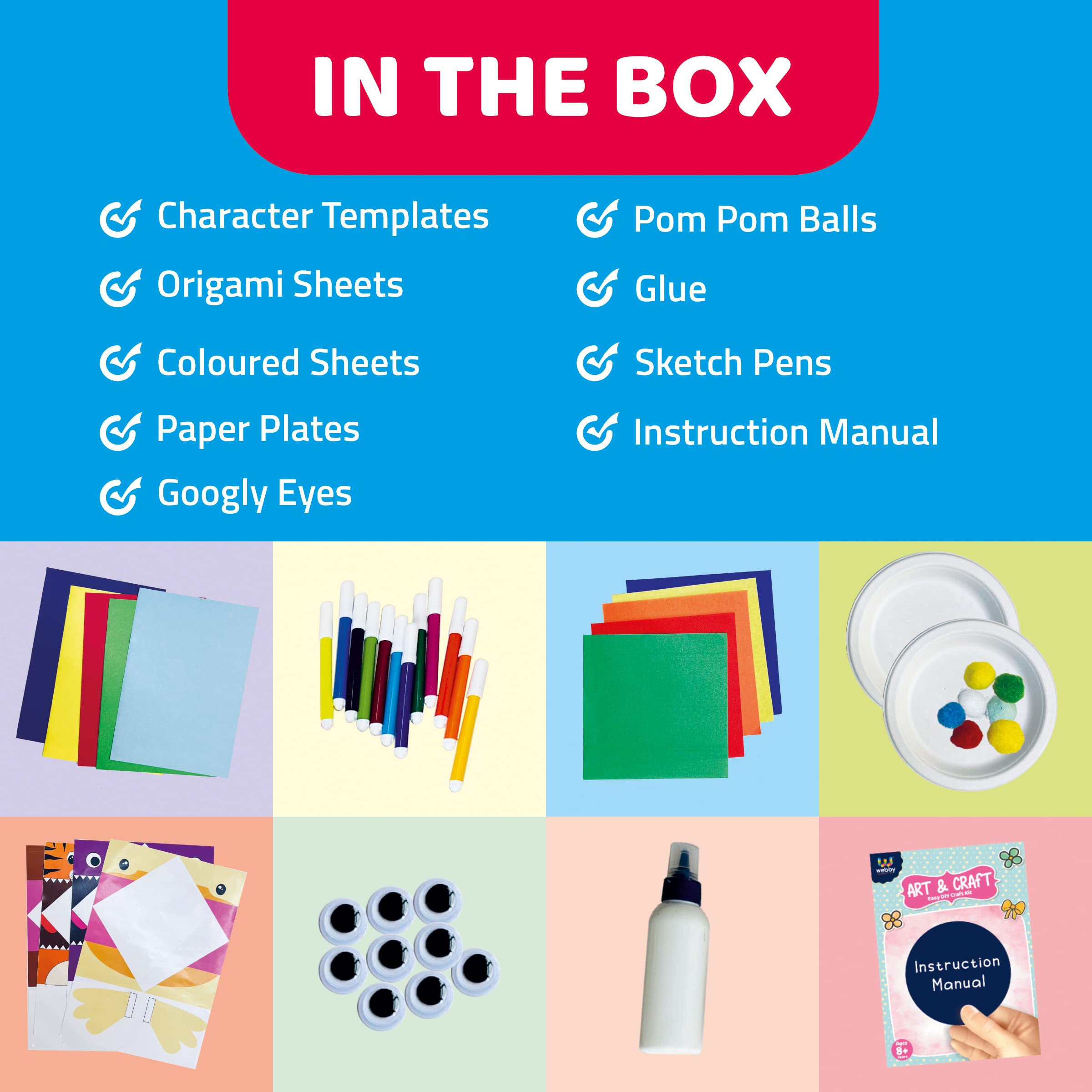• CONTENTS: This kit contains all the required material to make different Hand Puppet. It contains character template origami paper colour paper pom pom ball paper plates googly eyes sketch pen glue and instructions manual.
