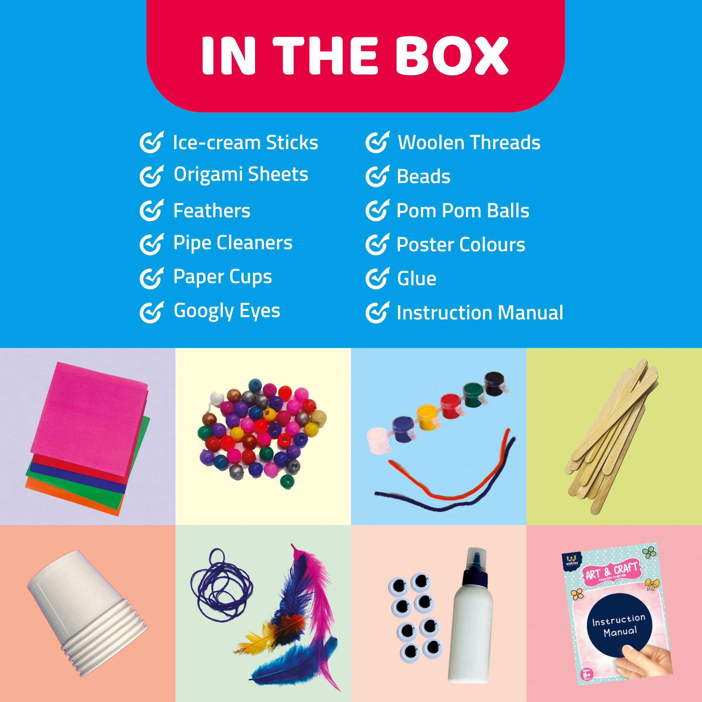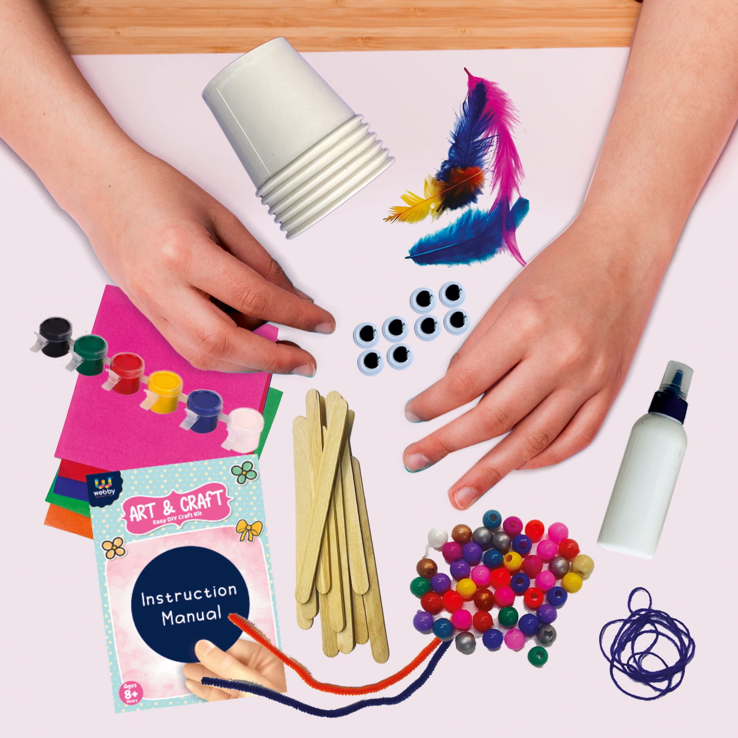Art and craft kits gives kids a sense of purpose and so Webby brings to you the Craft Kit a DIY activity for your little artists! The craft kit lets kids indulge in productive and creative play. With craft material let the little ones imagination go wild and free! It develops motor skills builds self-confidence and helps kids express themselves freely. Learn with fun! Art gives kids a sense of purpose and so Webby ensures kids indulge in creative and productive activities through this craft kit with eco-friendly wooden sticks! Webbys craft kit fine tunes motor skills fosters creativity builds self-confidence and patience and helps kids express themselves freely while letting them socialize. The build and paint activity makes way for quality parenting time thus strengthening the parent-child bond. This enchanting kit is a perfect gift for 8 years and up.