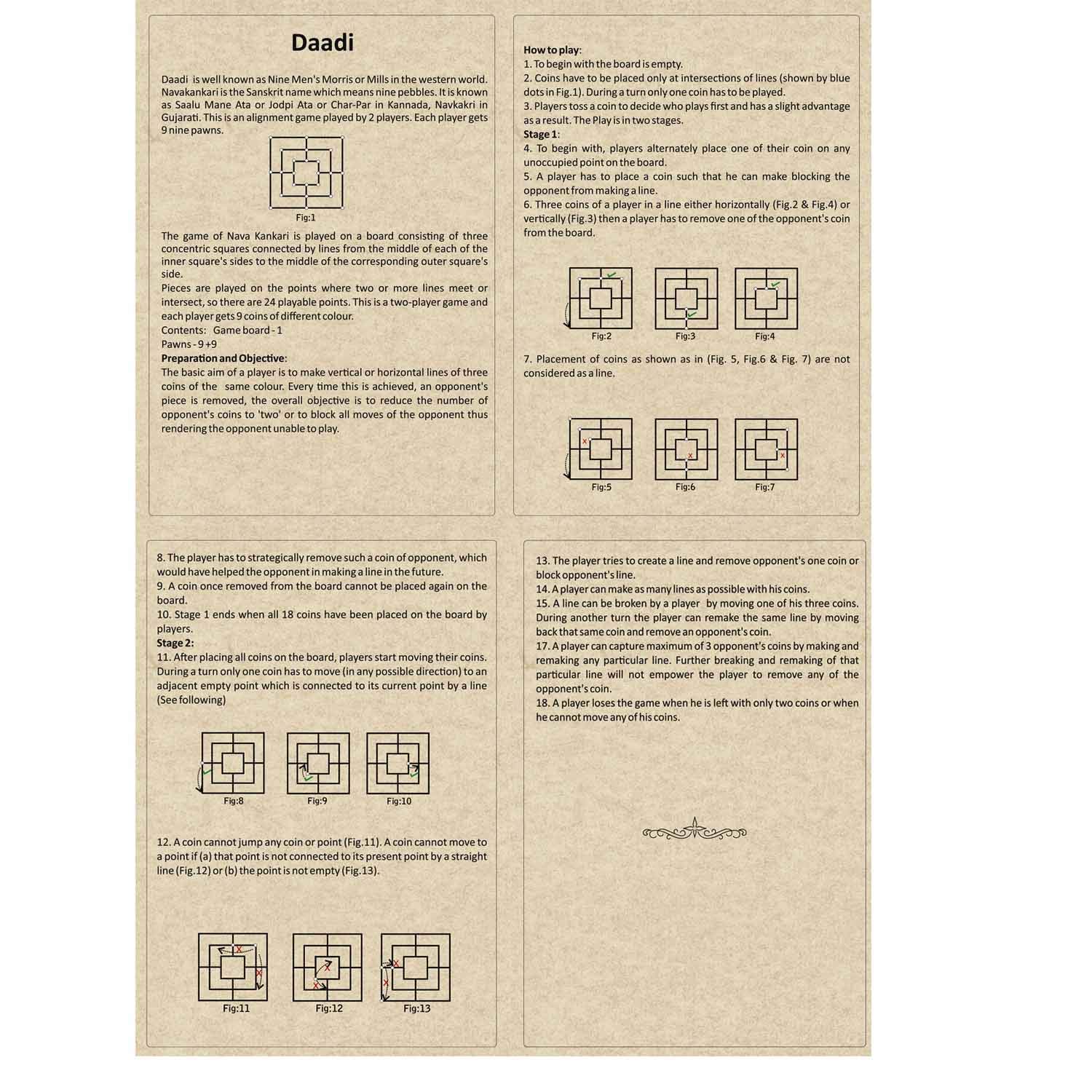 Ancient Living brings to you yet another folklore game this time Daadi. A board game that puts your skills in strategy and planning to test! Developed in the country of much diversity this game is called Navakankari in Sanskrit and Nine Menâs Morris Board in the western world. This eco-friendly board is hand-stitched and finished to perfection letting you enjoy the game to its extreme best! Sewed in Raw silk and woven with the finest fabric Dadi is the irresistible board game youâve got to own in your gaming rooms. Crafted in Raw silk: The exotic and quintessential fabric of raw silk darts its origin way back to the Indus Valley Civilization. Its smooth and rich silk is non-slippery and strongest of its kind. Raw silk is reputed to be the finest and delicate form of fabric was the appealing choice of Ancient Living in the making of its most-loved games! Hand-made Coins: The coins are made by the best of artisans using earth-friendly wood materials and natural color paint. Fun in the Box: Packed in an Earth-Friendly Box for safekeeping and zero threat of damage. Daadi: This strategy-alignment game that has been designed for children above five and adults is played by two players. Most of these games have their traces in different parts of the world. The primary aim of the game is to get as many points as possible by positioning three coins in a row. Instructions: The two opposing players are given 9 coins each of two different colors. The players try to move them to get 3 coins in a row. Though similar in movement to âNoughts and Crossesâ Dadi is far more complex than that in practicality.