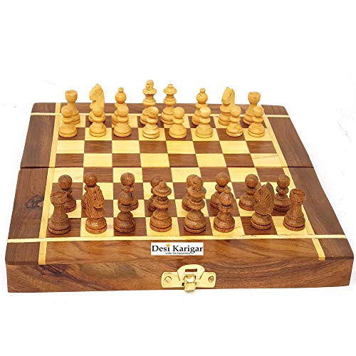Savor the royal game with a difference with our wooden chessboard. Lay the table for a war of the bright minds and enjoy each move as you play. Skilfully handcrafted by the rural artisans of desi karigar brand this chessboard is made of sheesham wood and haldu wood. It is a folding box type board with two partitions to keep the black and white pieces inside it when you are not playing. The pieces are also made of wood in light and dark shades of brown. When you wish to play then it can be unfolded and spread over. It is indeed a delightful item for entertainment and decoration of your surroundings. External dimension of chess board is around 8 inches x 8 inches when open and 8 inches x 4 inches when folded. Board is also decorated with wood inlays. Wooden chess board can be folded and it also works as storage to keep the pieces when folded. Brown coloured wood is sheesham (Indian rosewood) and light coloured wood is boxwood. It showers antIQue and classy look. It is durable and will last you for a long time. Challenge for your child to a game of chess and let him use his logical skills to devise strategies to counter your moves. Chess has long been regarded as a game that can have beneficial effects on learning on development especially when it is played from a young age. This classy convenient chess set makes a great gift. This wooden chess board is hand made and produced out of sustainable natural wood. This chess board serves as a nice showpiece. This chess board suits perfectly as decoration of your living room or your office table. Each chess board is individually branded by the natural grains of the wood and the touch of the craftsman of desi karigar. Desi karigar brings you the best of Indian handicraft products from all around India made by the rural artists. Their classic design and structure makes them a must have art amongst those who love collecting distinct showpieces