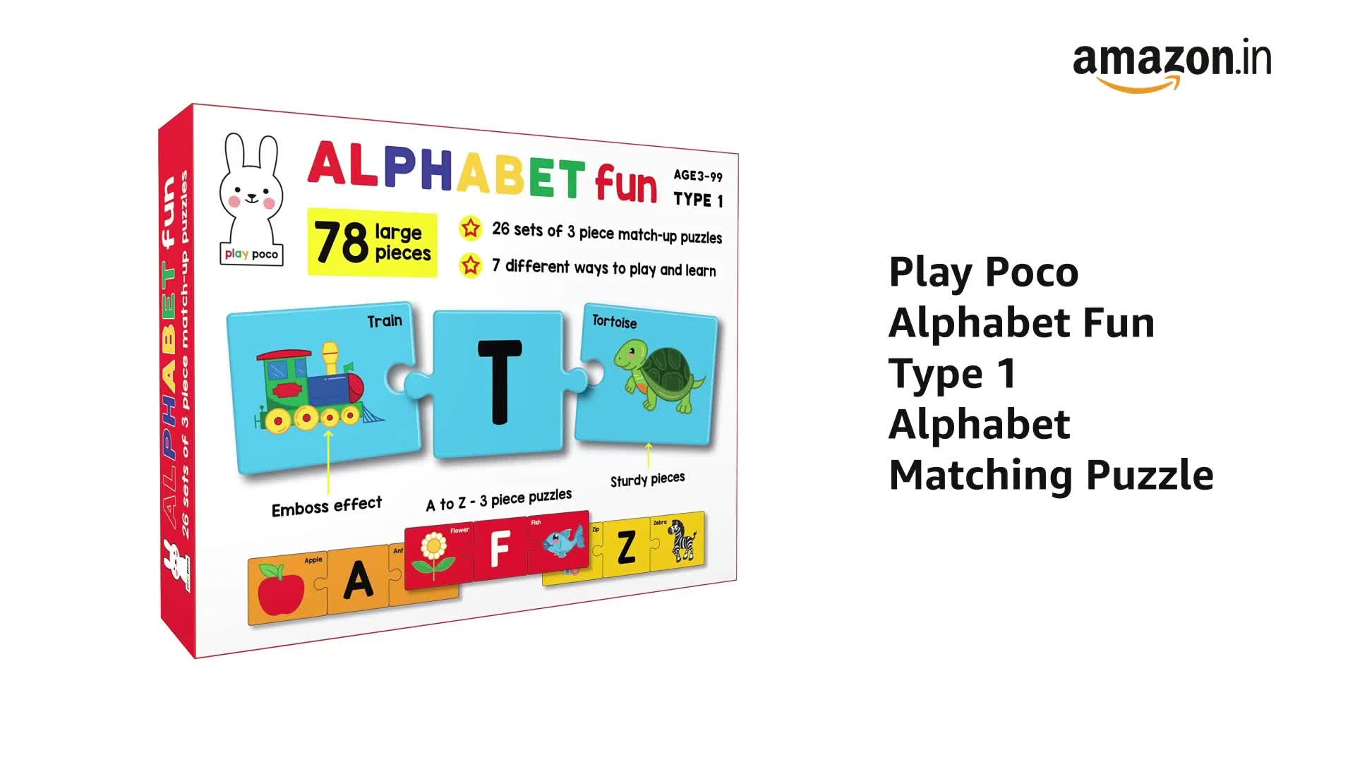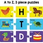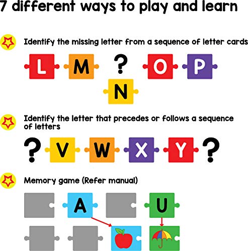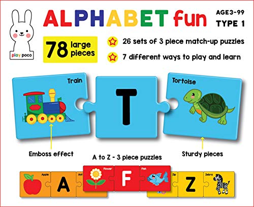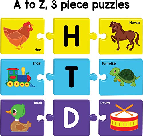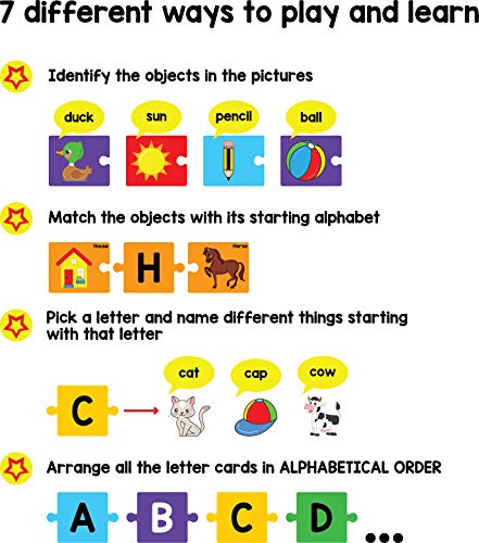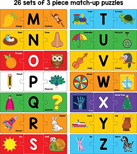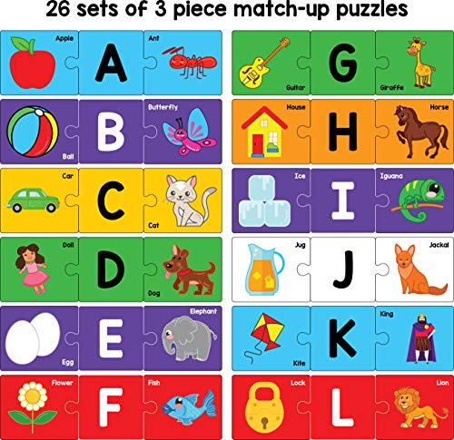 This colorful set of 78 puzzle cards provide children with an excellent way to learn letter and word recognition. The 26 sets of 3 piece match-up puzzles have beautiful illustrations. Simply match the three pieces together to complete the puzzle.Many ways to play ?Ask the kids to identify the objects in the picture cards.Take any letter card and ask the kids to name different things starting with that letter.Spread the letter and picture cards. Ask the kids to match the pictures with their starting alphabet.Take out all the letter cards and shuffle them. Ask the kids to arrange all the letter cards in alphabetical order.Choose a sequence of 4 to 5 letter cards. Ask the kids to identify the letters that precede and follow the sequence.Create a ssequence of 4 to 5 letter cards. Ask the kids to close their eyes. Remove any letter from the sequence. Ask the kids to open their eyes and identify the missing letter.Memory game - Mix all the letter and picture cards and lay them face down. The first player turns any 2 cards. If the letter and picture cards match the player will keep the set and continue playing. If the letter and picture cards do not match keep them face down again. Keep playing till all the cards are matched. The player with the highest number of sets wins.
