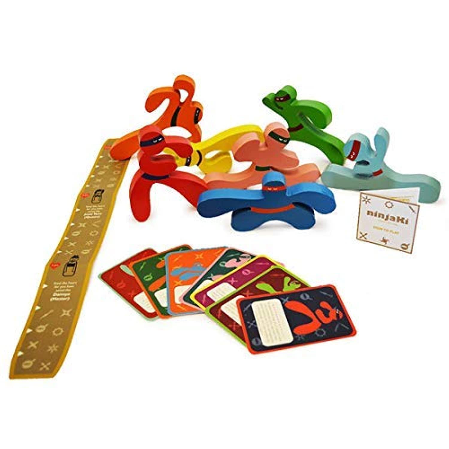 7 Wooden ninjas with 7 cards and a measuring scale letting your kid skilfully balance ninjas atop one another