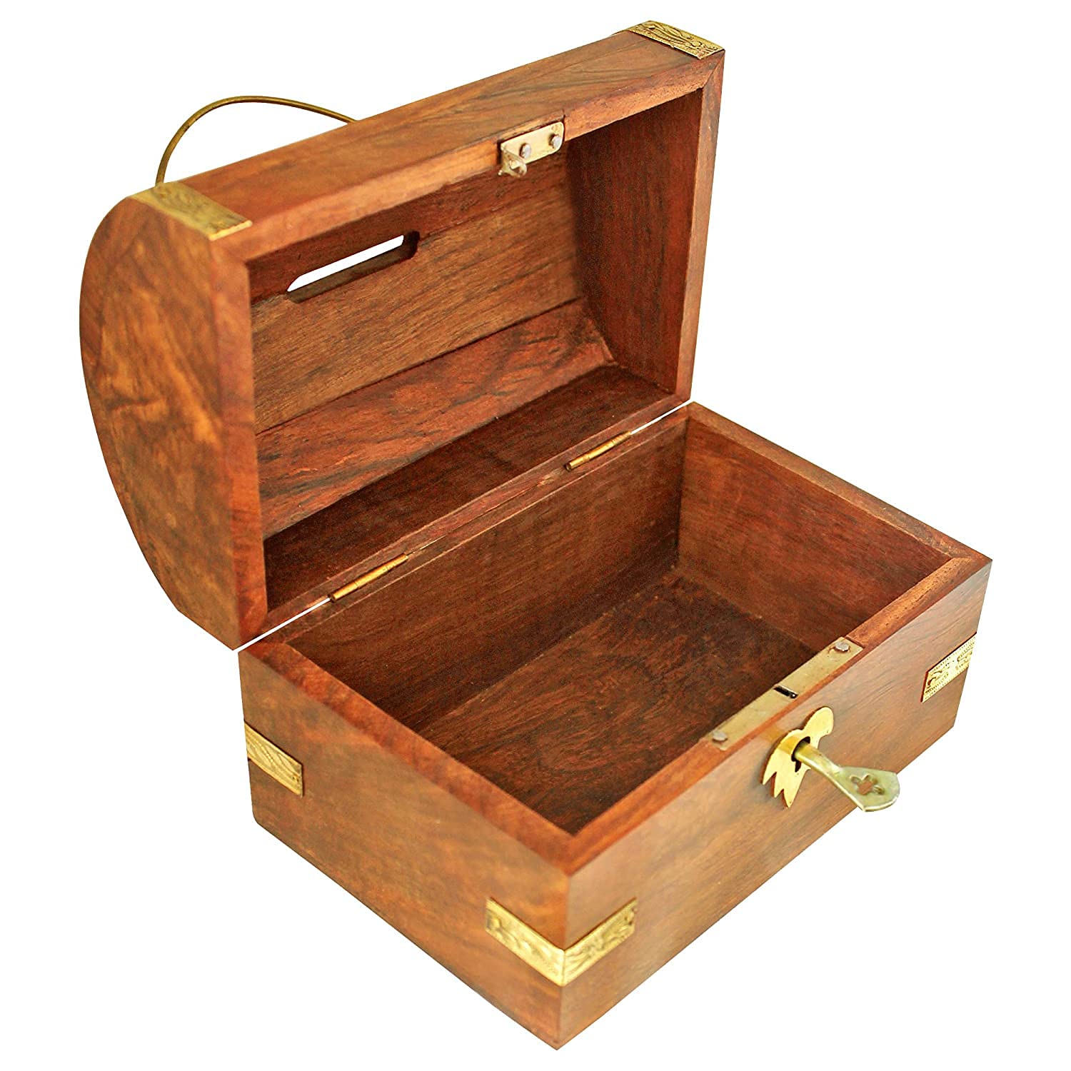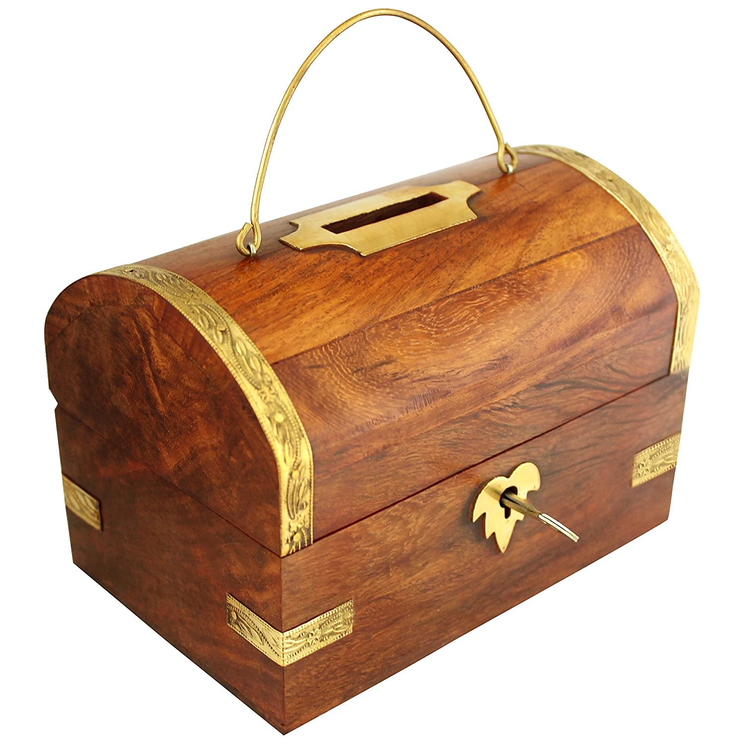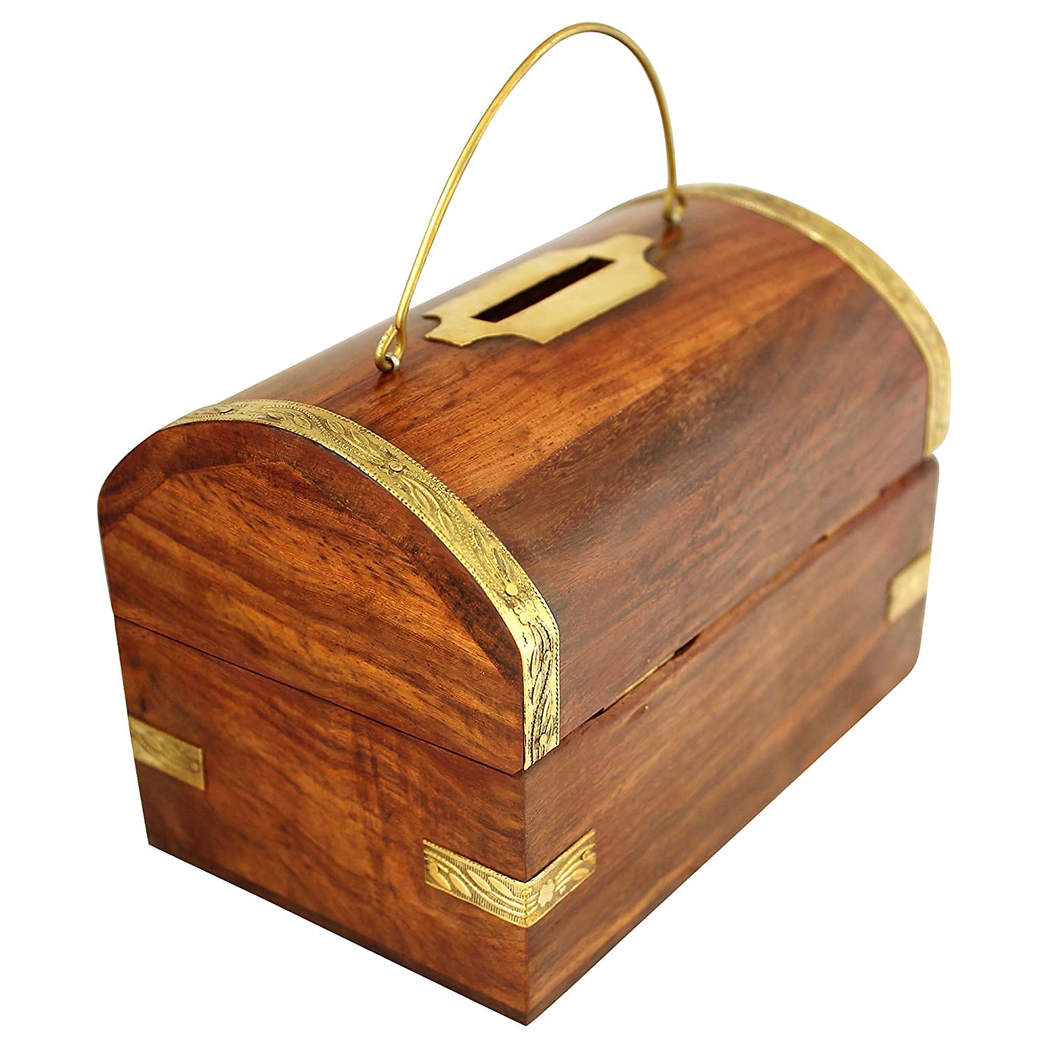 Historians have found money boxes that date back to the times of Ancient Greece indicating that mankind has been making special boxes for the safekeeping of coins for centuries. Our Handmade Wooden Piggy Bank - Money Bank - Money Saving Box - Coin Box Decoration continues this tradition and is one of our most popular handmade Indian gifts for children and adults alike. This Savings box/money bank/piggy bank is handcrafted from wood and has a coin slot . It is nicely polished and decorated. May be used for keeping your trinkets and money. Best gift for kids girl boys and adult. Make learning to save money fun for a child of any age! Order the Wooden Money Bank for a birthday the Summer holidays or any other occasion and give that special little one a truly unique gift for kids!